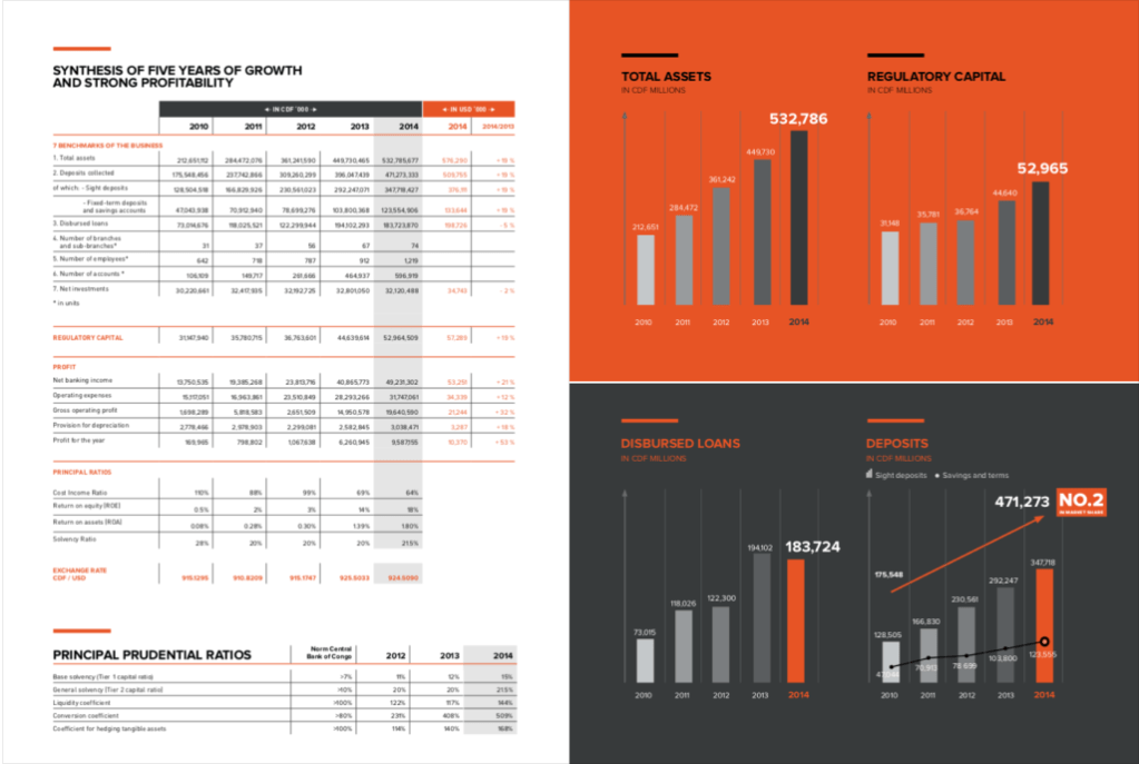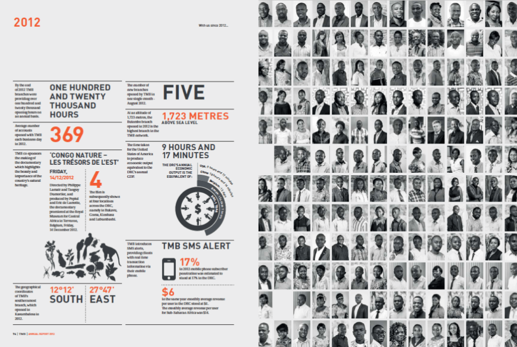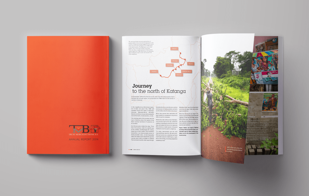 I’ve made the annual reports for the Trust Merchant Bank for 2 consecutive years. They wanted the first one to be minimal, high quality and corporate. The second one needed to be in line but more colourful and bringing in the work of Congolese artists.